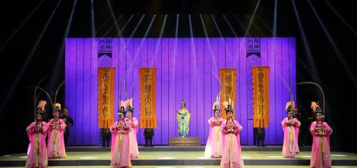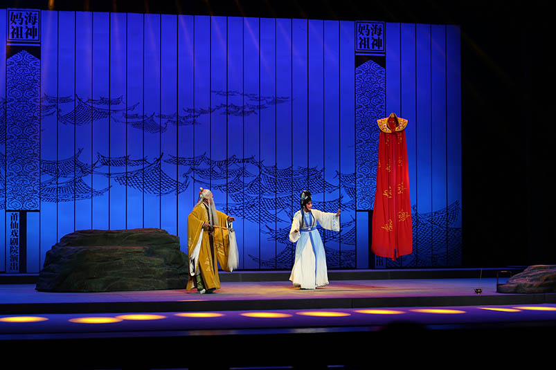 莆仙戲《海神媽祖》主要描述的是林默娘痛心海難無情而無私救苦救難,深得上天感動,最終被授予遇災(zāi)警示及造福于民的法力,從平凡漁家女子到海上女神的傳奇。劇目以敘事詩般的藝術(shù)手法刻畫出媽祖娘娘扶危濟困的偉大形象,靈活展示了媽祖娘娘德、行善、大愛”的精神。隨著海上貿(mào)易和文化交流的延伸,媽祖信俗從沿海各地傳播到東南亞乃至全世界,媽祖也因此成為了“海上絲綢之路保護神”。