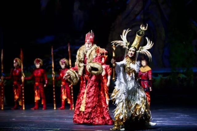 演出中的很多形象都有著東西方文化的雙重印記。主人公的形象既能讓觀眾聯(lián)想到孫悟空也帶著西方傳統(tǒng)神話的人物印記。劇中有東西方兩個王國,西方的是以龍和紅色元素來代表,而東方的則以鳳凰和金色元素來代表。