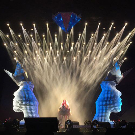 一向?qū)σ魳酚兄鴺O致要求的張惠妹團(tuán)隊(duì),在「烏托邦世界巡城演唱會(huì)」中,更是投重金打造世界級(jí)硬件設(shè)備及舞臺(tái)道具。作為打造演唱會(huì)燈光效果的主力武器,浩洋電子轟天炮G10B憑借全球頂級(jí)的高亮度輸出特性、銳利的光束和完美的棱鏡效果,為“烏托邦”現(xiàn)場營造了時(shí)而狂野,時(shí)而歡樂的舞臺(tái)氛圍。而浩洋電子另一款小體積、長壽命的染色燈PT330W,也用柔和細(xì)膩的CMY均勻渲染效果,令現(xiàn)場似烈果繽紛、如沐幻境。在燈光師的詮釋之下,二者光束與染色交融演繹,使整個(gè)巡演舞臺(tái)呈現(xiàn)出靈動(dòng)、華麗的光影視覺,讓歌迷獲得極具沖擊力的感官體驗(yàn)。數(shù)十場演出下來,由浩洋燈光營造的超震撼視覺效果,無疑成為「張惠妹2015烏托邦世界巡城演唱會(huì)」的最大亮點(diǎn)之一。