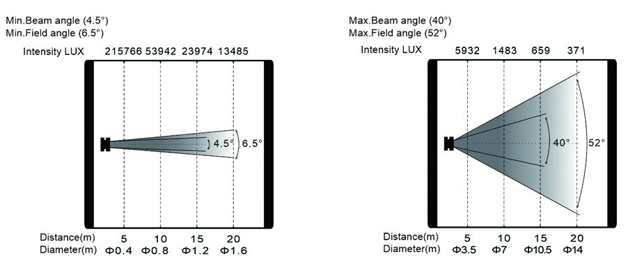 變焦范圍:光束角:4.5°-40°,光斑角:6.5°-52°